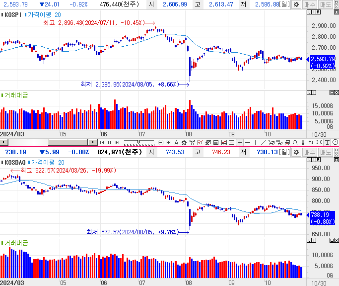 코스피, 코스닥 모두 약 +0.9% 상승 마감하였습니다. 그런데 문제는 역시 거래대금입니다. 코스피 9.7조, 코스닥은 4.6조를 기록하였습니다. 한때 거래대금 10조도 잘 넘겼던 코스닥이 현재는 5조도 넘기지 못하고 4조원대로 가라앉았습니다. 지금 분위기로는 지수 상승이 쉽지는 않아보입니다.