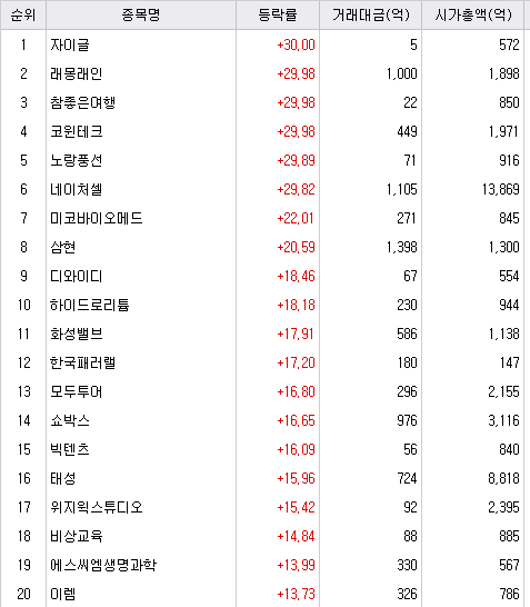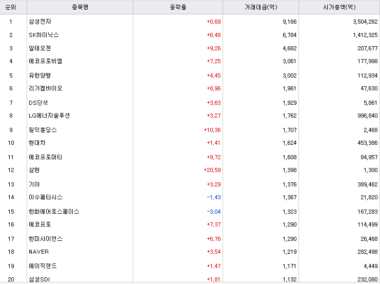 거래대금 20위 안의 종목 중 2 종목만 마이너스를 기록하였고 18 종목은 상승 마감하였습니다.
