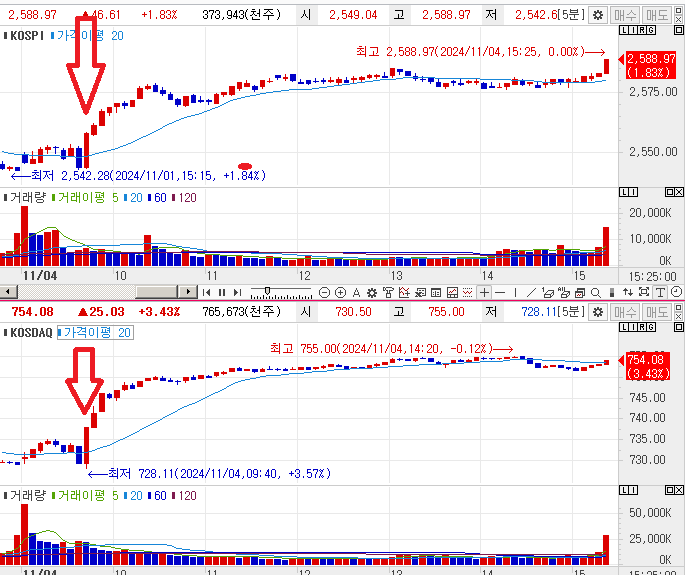 오전 거래 중 9시 40분경에 금투세 폐지 속보 뉴스를 본 것 같은데, 비슷한 시간부터 지수가 상승하였습니다.