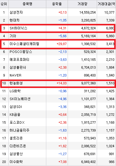 그 대신 반도체 관련주인 SK하이닉스가 +4%, 2차 전지 관련주인 이수스페셜티케미컬이 상한가. 한농화성(2차 전지, 전고체)이 +14%로 거래대금 상위 종목을 이끌었습니다.