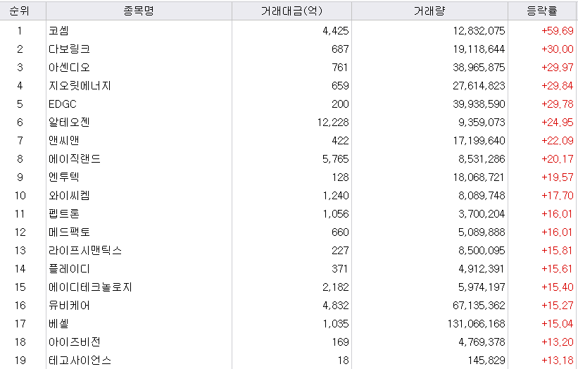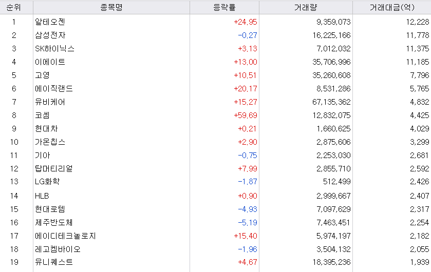 알테오젠이 거래량 1위를 기록했습니다. 미국 MSD사와 공급계약을 체결하여, 개발 시 로열티가 1조 원이 될 것이라고 알려지면서, 어제 11%, 오늘 25% 상승하였습니다. 오늘은 상한가까지 기록했다가 떨어진 모습입니다.