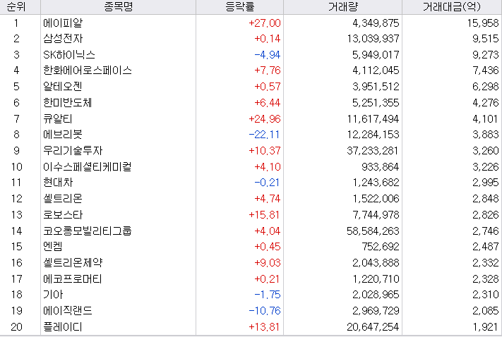 오늘 전체적으로 시장이 가라앉은 분위기 사이로 반도체, 반도체장비, 로봇, 우주항공 관련주가 시장을 이끌었습니다.