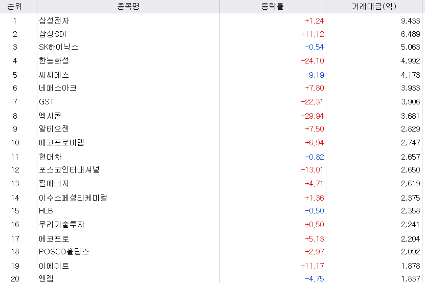 오랜만에 삼성SDI(2차전지)가 2위에, SK하이닉스가 3위에 등극했습니다.