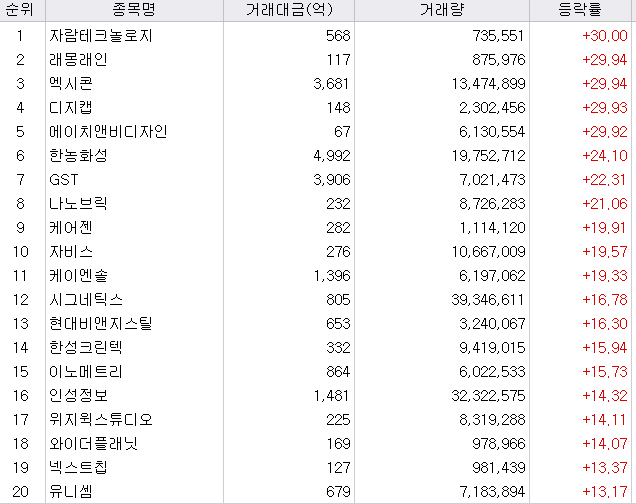 한농화성(2차 전지 전고체)에 이어 씨씨에스가 5위입니다. 씨씨에스는 초전도체 관련주입니다. 서남, 덕성, 신성델타테크가 초전도체 관련주였죠. 그 뒤를 이어 반도체 장비 주인 GST, 엑스콘이 7~8위입니다.