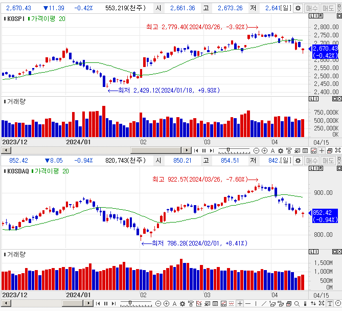이란과 이스라엘의 전쟁 가능성으로, 전일 미국 지수가 하락하면서 오늘 우리의 지수도 하락 출발을 예상했습니다.