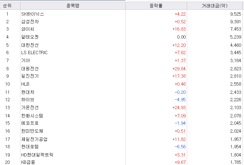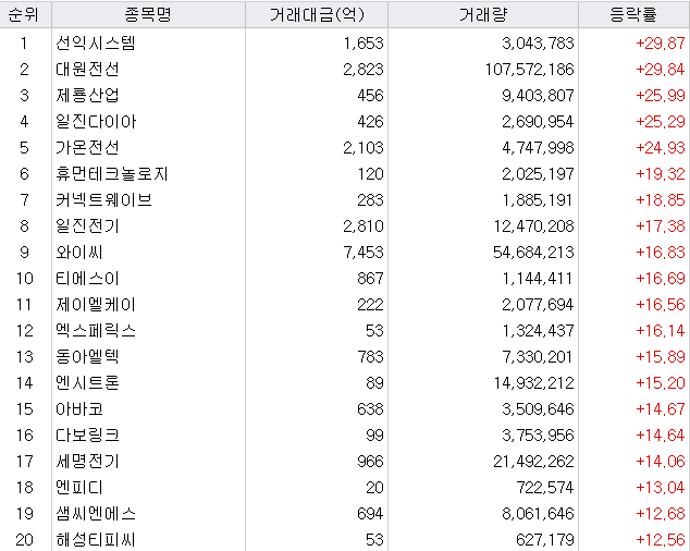 요즘 순위에 올라왔던 종목으로는 대한전선, 가온전선, 대원전선, LS Electric, 제룡전기, 일진전기 등이 있습니다.