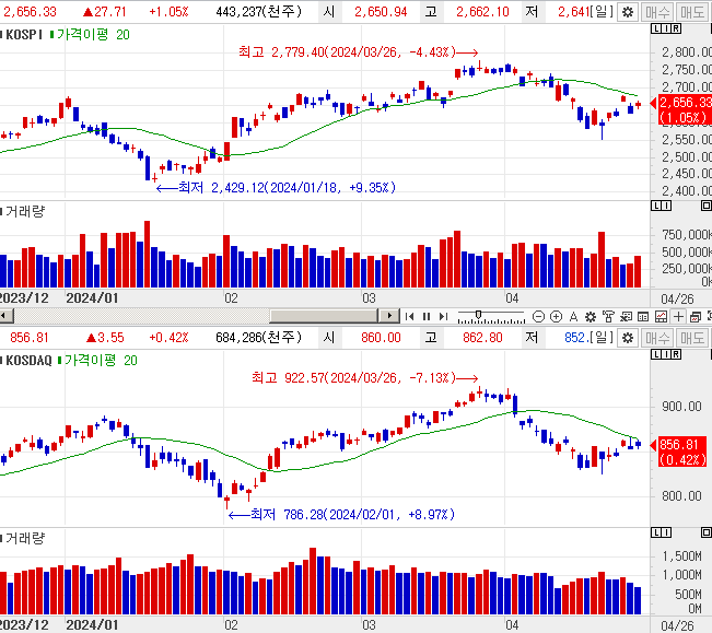 코스피는 +1.5% 상승, 코스닥은 +0.5% 상승하였습니다. 2일 전에는 갭상승, 어제는 갭하락, 오늘은 갭상을 이어가며 시장을 흔들었지만 크게 보았을 때 상승 추세의 조정이 마무리되는 느낌입니다.
