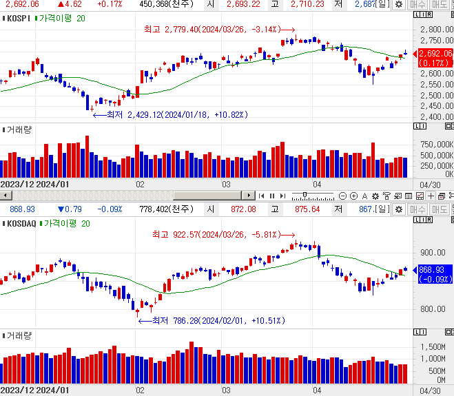 코스피, 코스닥 모두 보합입니다. 단기 상승추세를 유지하고 있습니다.
