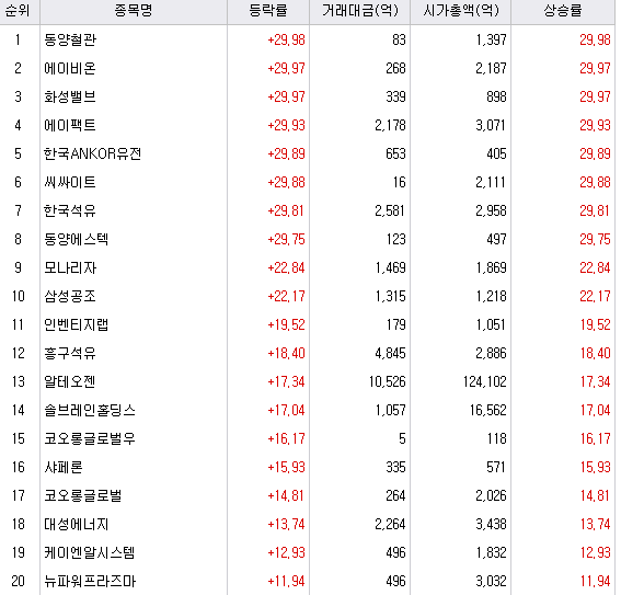 역시 석유 가스 관련주들이 주로 상한가를 기록하였습니다.