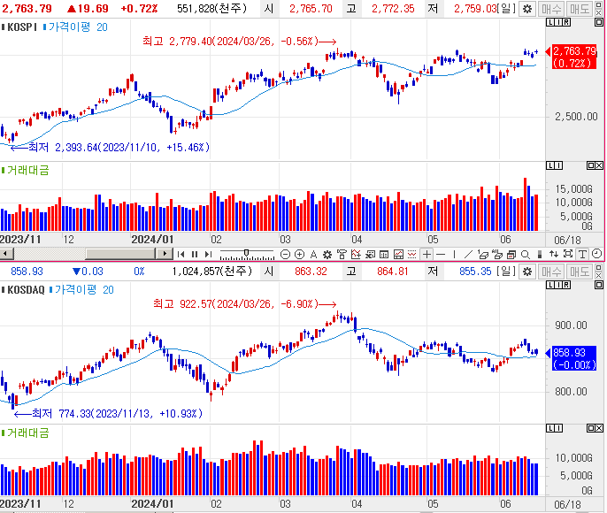코스피는 +0.75% (거래대금 13조), 코스닥은 보합 (거래대금 8.5조)를 기록하였습니다.