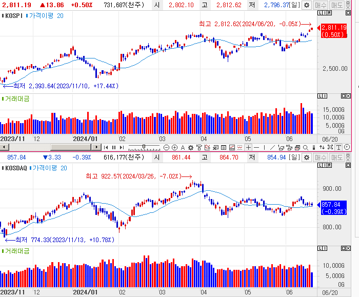 코스피는 +0.5%, 코스닥은 -0.4%를 기록하였습니다. 안정적으로 2800을 유지한다면 2900은 쉽게 올라갈 것으로 보입니다.