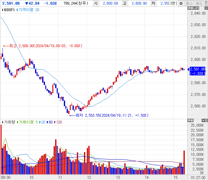 코스피는 -1.6% 하락, 코스닥도 -1.6% 하락하였습니다. 장중 -3%까지 하락했다가 반등하면서 겨우 -1.5%로 마감하였습니다. 아래는 코스피 오늘 하루 지수 변화입니다.