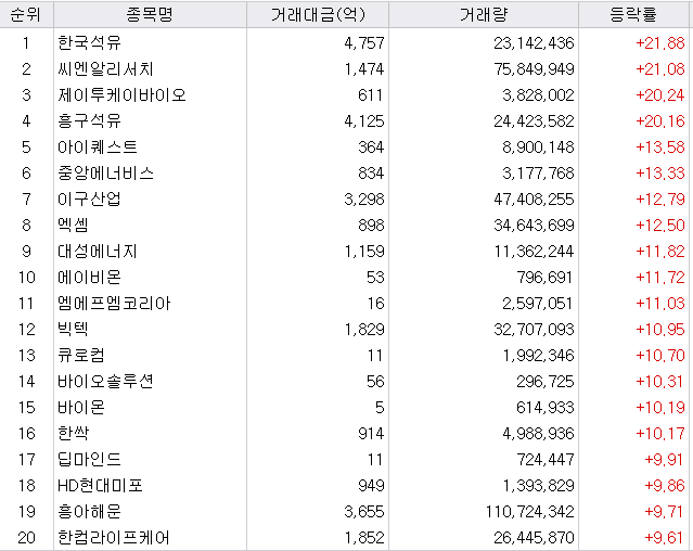 오늘은 상한가를 기록한 종목이 없습니다. 다만 중동 전쟁우려로 석유 관련주인 한국석유, 흥구석유가 20%에 가까운 상승을 하였습니다. 그 외에는 에너지, 제약 관련주들이 상승하였습니다.