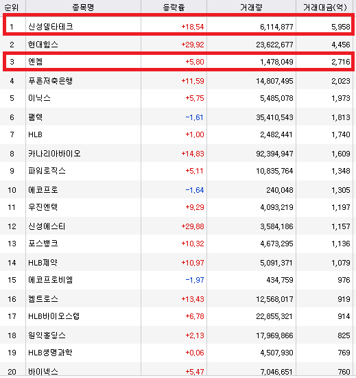 요즘 대장주인 신성델타테크의 거래량이 1위입니다. 초전도체 관련주입니다.