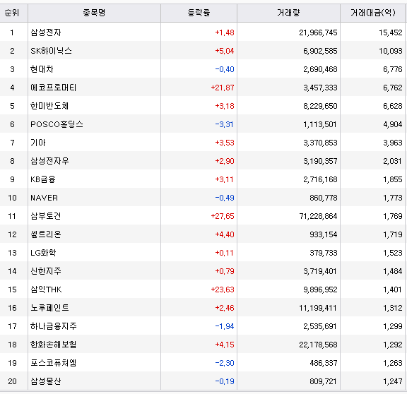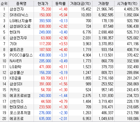 가장 눈에 띄는 종목은 SK하이닉스입니다. 삼성전자와 같은 반도체 업종에 속합니다만, 삼성전자보다는 시총이 작기 때문에 더 크게 상승이나 하락할 수 있는 종목입니다.