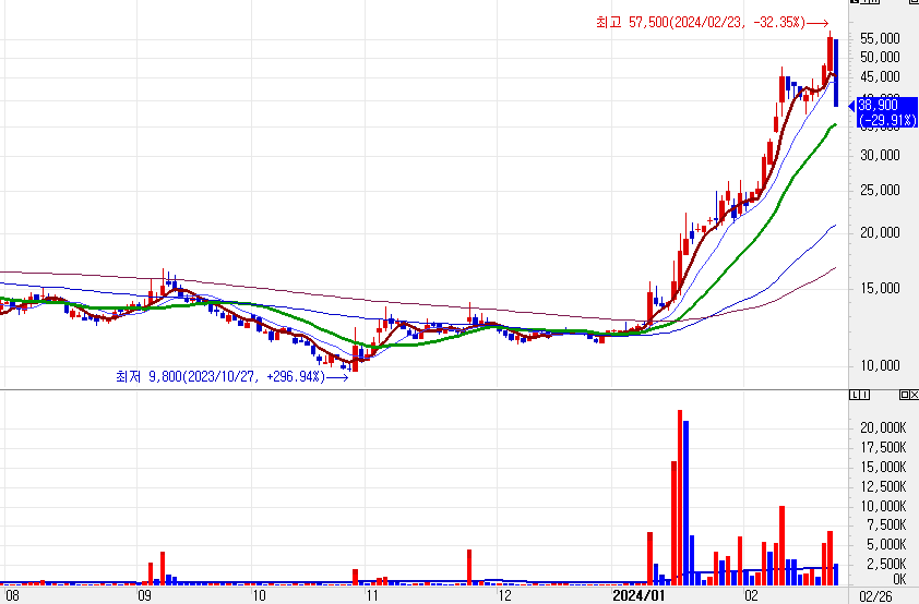 하루 만에 -30%를 기록한 것입니다. 어제 신고가를 보고 매수한 투자자는 오늘 매우 놀랄만한 일이 일어난 것입니다.
