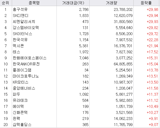 - 홍구석유 : 실적이 바닥을 찍었다는 기대감에 상한가. 같은 업종인 한국석유도 22% 상승하였습니다.