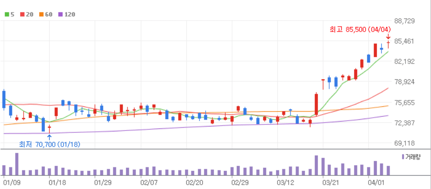 삼성전자는 3월 20일 이후 15% 나 상승하며 시장을 이끌고 있는 모습입니다.