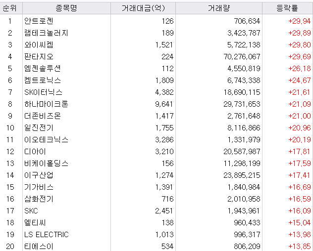 - SK이너틱스 : 3번의 상한가에 이은 20% 상승률입니다. 끝을 모르고 상승 중입니다.