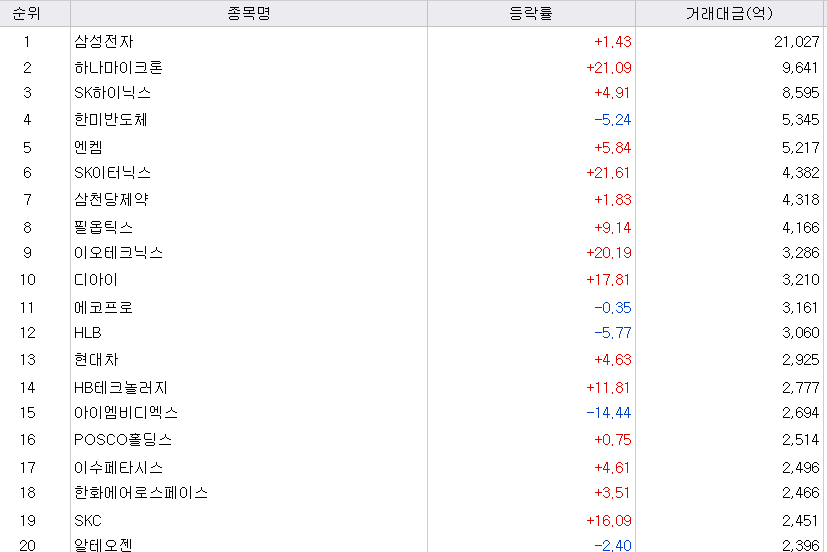 - 하나마이크론 : 오늘 시장의 중심종목이었습니다. 21% 상승하며 존재감을 드러냈습니다.