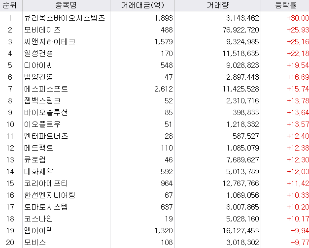 코스피는 장중 1.5%까지 상승을 했다가 하락였으나 다시 반등하여 1.5% 정도에서 마감하였습니다. 코스닥도 1.5%까지 상승하였다가 하락하였으나 회복은 하지 못하고, 0.5% 상승으로 마감하였습니다. 15시부터 삼성전자와 SK하이닉스의 매수세가 강해지면서 거래소 지수를 끌어올린 것으로 보입니다.