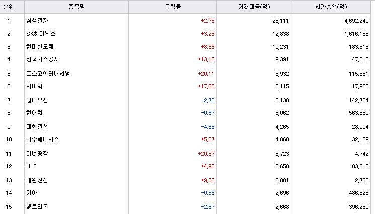 거래대금 1위 ~ 3위까지 모두 반도체 관련주가 기록했습니다.