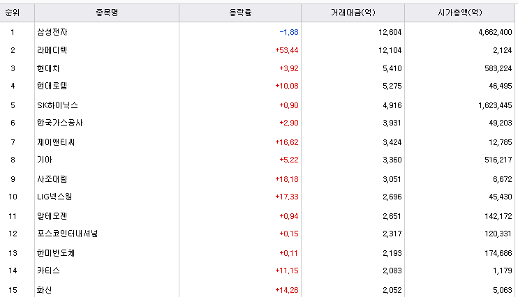 삼성전자를 제외한다면 오늘 상장한 라메디텍이 가장 많은 거래대금을 기록하였습니다.