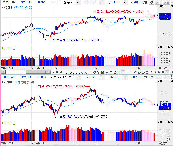 갭하락으로 시작하였으나 보합으로 마감하였습니다. 코스피는 약 10조, 코스닥은 약 8조의 거래대금을 기록하였습니다.