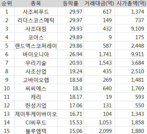 세계적으로 '냉동김밥 ' 열풍으로 인한 실적 기대감으로 상한가를 기록하였습니다.
