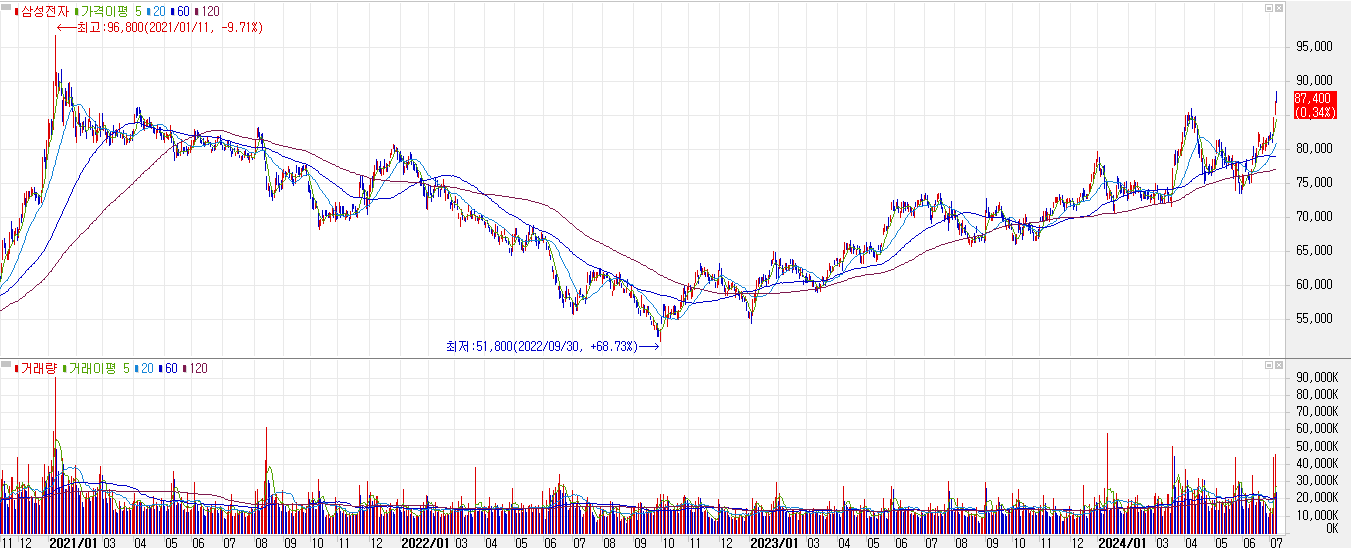 2021년 1월 26일 이후 신고가를 기록하였습니다. 2021년 1월 11일은 삼성전자 역사적 신고가였던 96800원을 기록한 날입니다. 3년 만에 새로운 역사적 신고가를 기록할지 궁금해지네요.