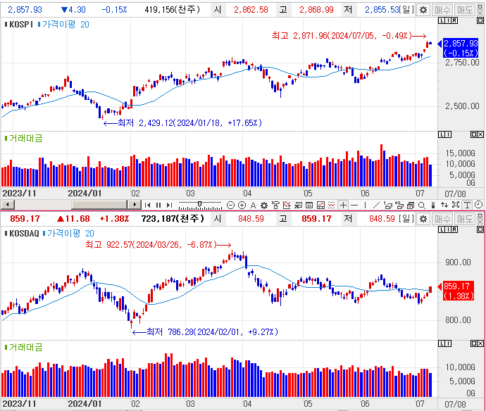 코스피는 하락추세를 유지 중이며, 코스닥도 상승 중입니다.