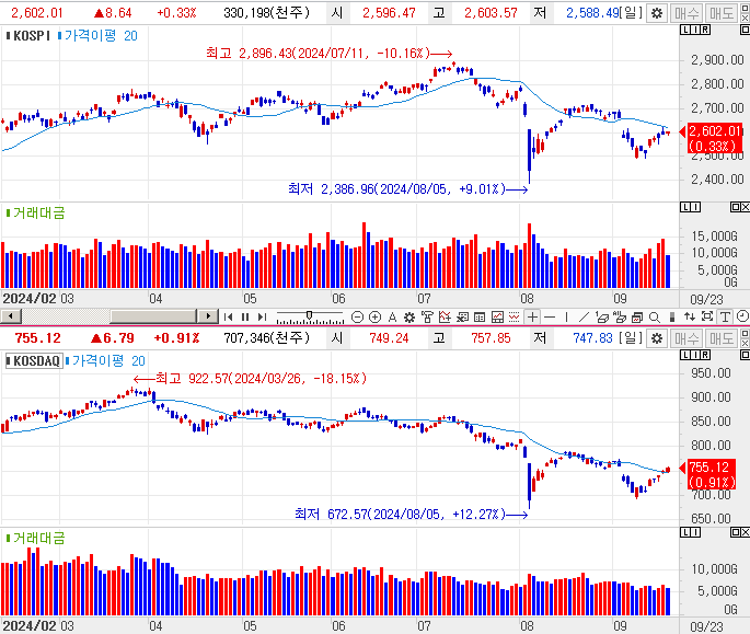 거래대금은 코스피가 9.3조, 코스닥이 5.8조를 기록하였습니다.