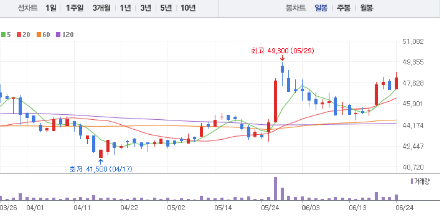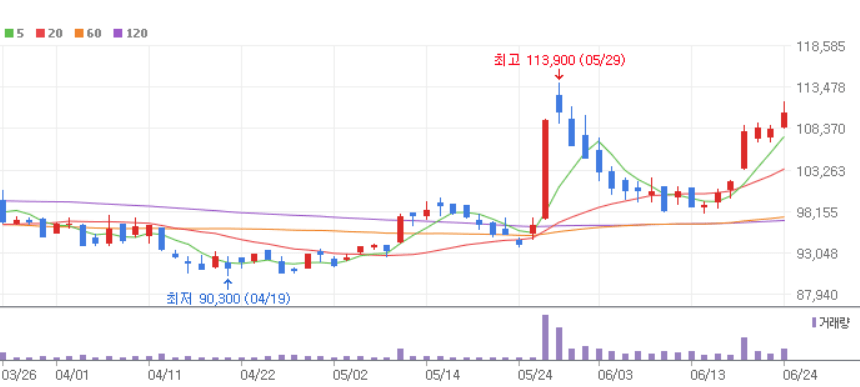 최근 외국인과 기관의 양매수가 집중적으로 들어오고 있습니다. 그 영향으로 주가는 전고점인 113,900원을 향해서 오르는 중입니다. 연초 현대차가 배당락일에 하락하지 않고 오히려 상승했던 힘도 외국인과 기관의 양매수에 있었습니다. 이번 LG전자의 경우는 배당락일에 어떤 모습을 보여줄지, 전고점까지 도달할지가 궁금하네요.